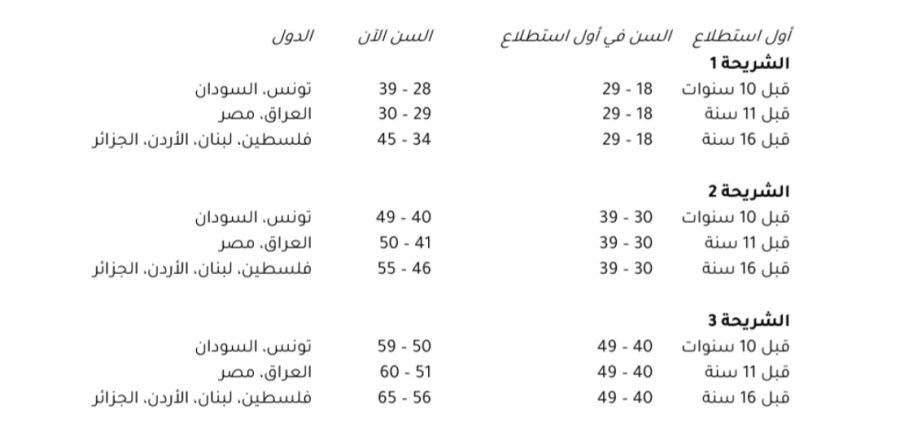 كان قد سبق استطلاع الآراء حول هذه المسألة في ثماني من الدول التي استطلع فيها الباروميتر العربي الآراء في دورته السابعة، قبل عشر سنوات على الأقل، خلال الدورة الأولى والثانية. يسمح لنا هذا بمقارنة قطاعات عرضية ممثلة للسكان من مختلف الشرائح العمرية لتحليل تغيّر آرائهم منذ استطلاعها أول مرة. في هذا التحليل، قسّمنا السكان إلى ثلاث شرائح عمرية. الشريحة 1 تضم المواطنين والمواطنات الذين كانوا بين 18 و29 عاماً في الاستطلاع الأول، والشريحة 2 هي للمواطنين والمواطنات الذين كانوا في شريحة 30 إلى 39 عاماً، والثالثة لمن كانوا بين 40 و49 عاماً. باستثناء تداخل محدود القدر في الشريحة 1، فإن المواطنين والمواطنات المعنيون قد كبروا الآن على الشريحة العمرية التي كانوا فيها في الأصل.