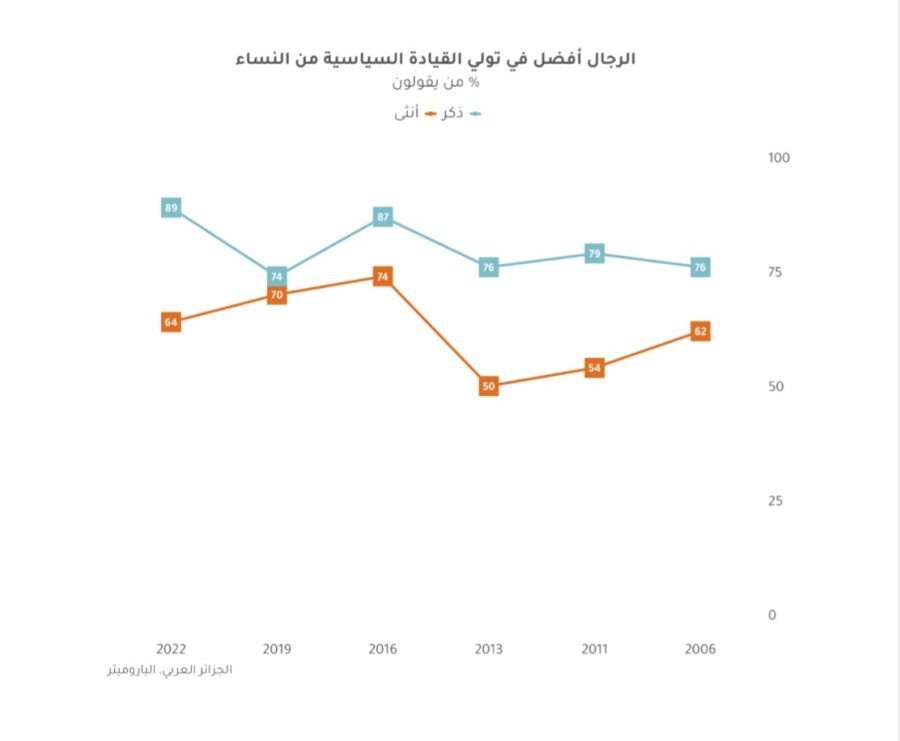 على أن المشهد العام لفترة الـ 16 سنة الماضية يخفي وراءه توجهات أحدث للرأي العام الجزائري. رغم أن الرجال في الجزائر على ما يبدو قد فقدوا الثقة في القدرات القيادية السياسية للنساء، فالأمر نفسه لا يمكن أن يُقال عن آراء النساء الجزائريات. فالتنديد بالبرلمانيات اللاتي افتقرن لأية خبرات سابقة أدى إلى زيادة في التوافق على أن الرجال أفضل في مناصب القيادة السياسية عام 2016. لكن النساء الجزائريات بدأن في الإيمان أكثر وأكثر بقدرات القيادة السياسية للمرأة؛ إذ تراجع تأييد النساء الجزائريات للمقولة المذكورة 10 نقاط مئوية في آخر ست سنوات.